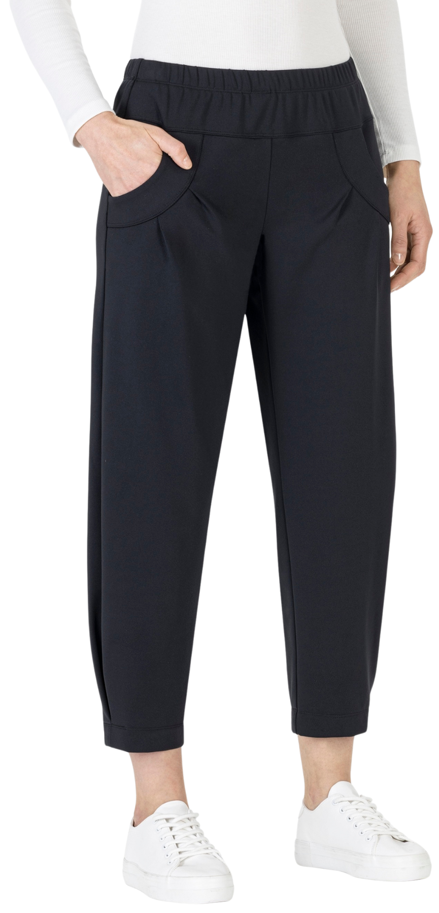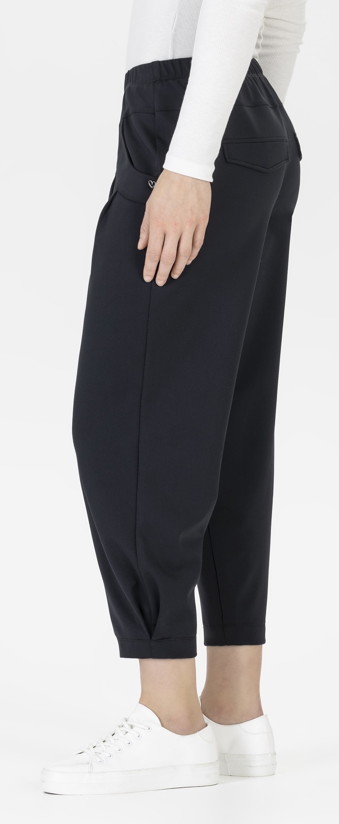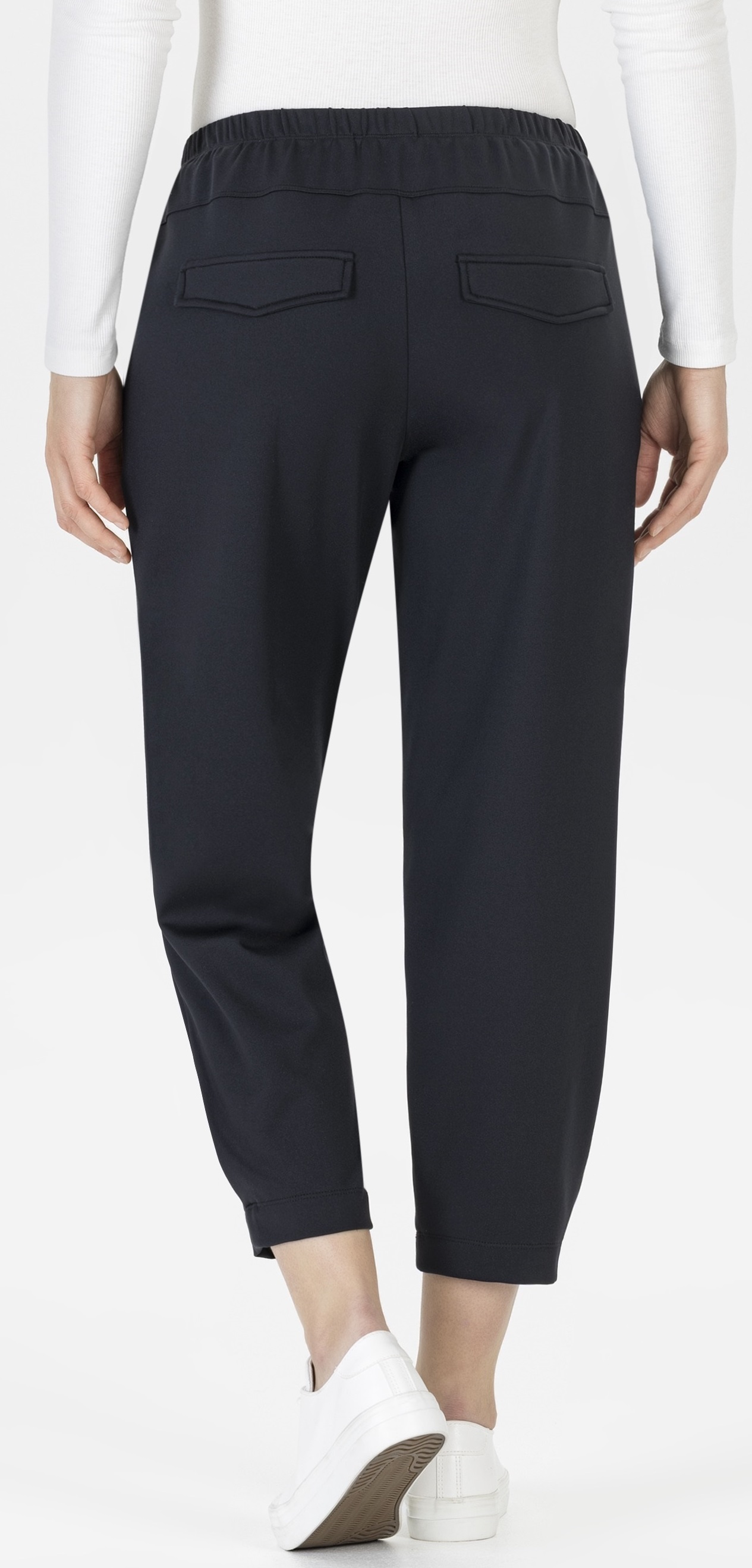 Diese Hose überzeugt mit einem elastischen Bund, der für angenehmen Tragekomfort sorgt. Vorne befinden sich besondere Eingrifftaschen, die durch feine Faltendetails unterhalb der Taschen stilvoll ergänzt werden. Die gecrepte Jersey Ware ist weich und angenehm zu tragen.In Größe 38 beträgt die Innenbeinlänge 68 cm und die Fußweite 32 cm, wodurch die Hose eine moderne und zugleich bequeme Passform erhält.