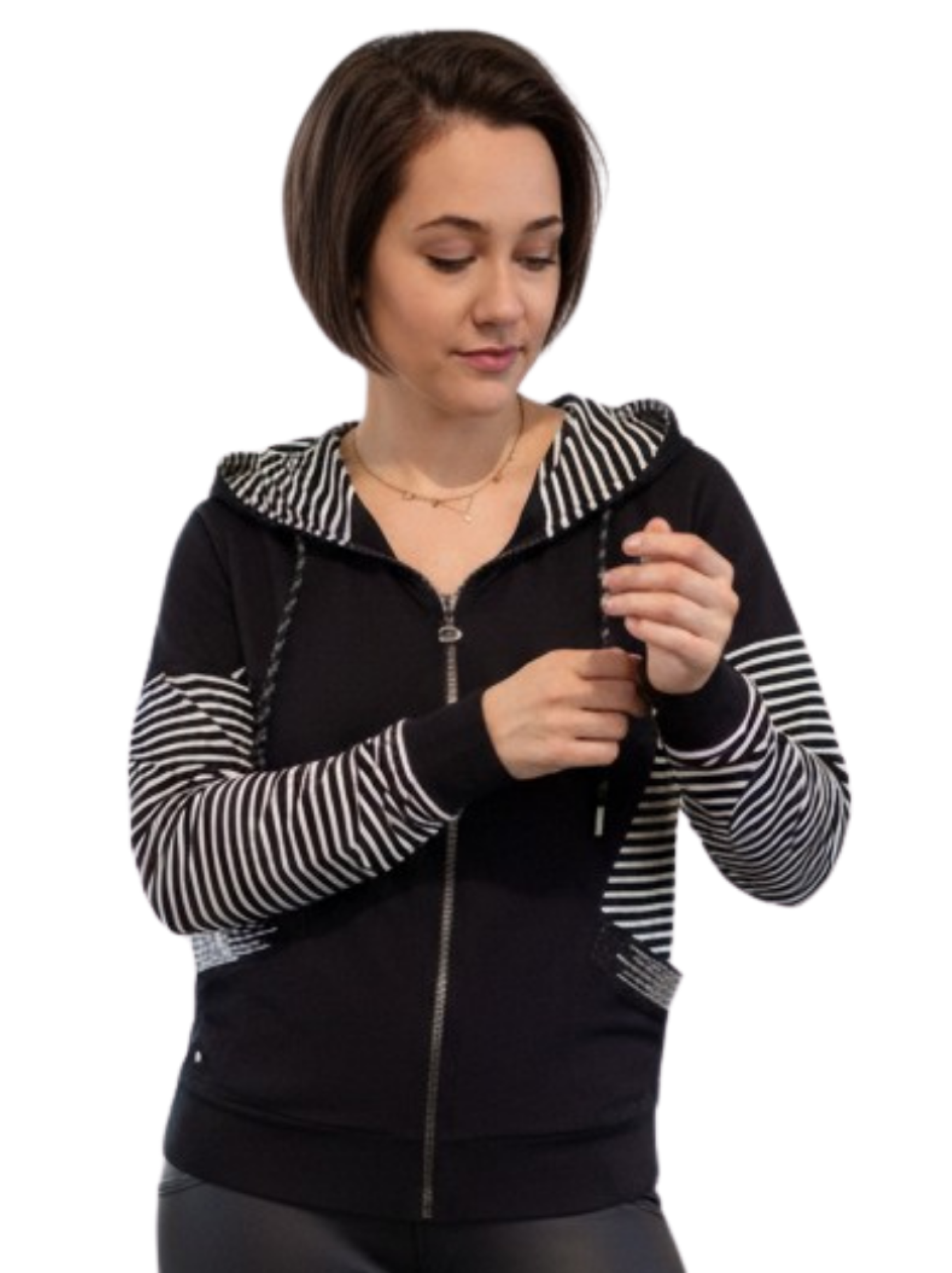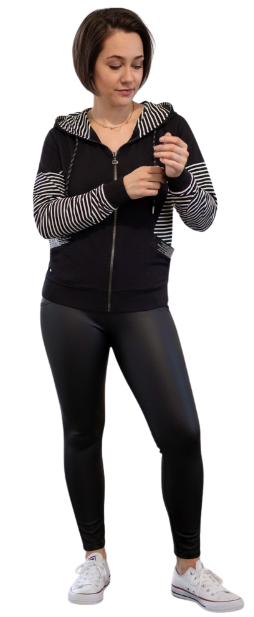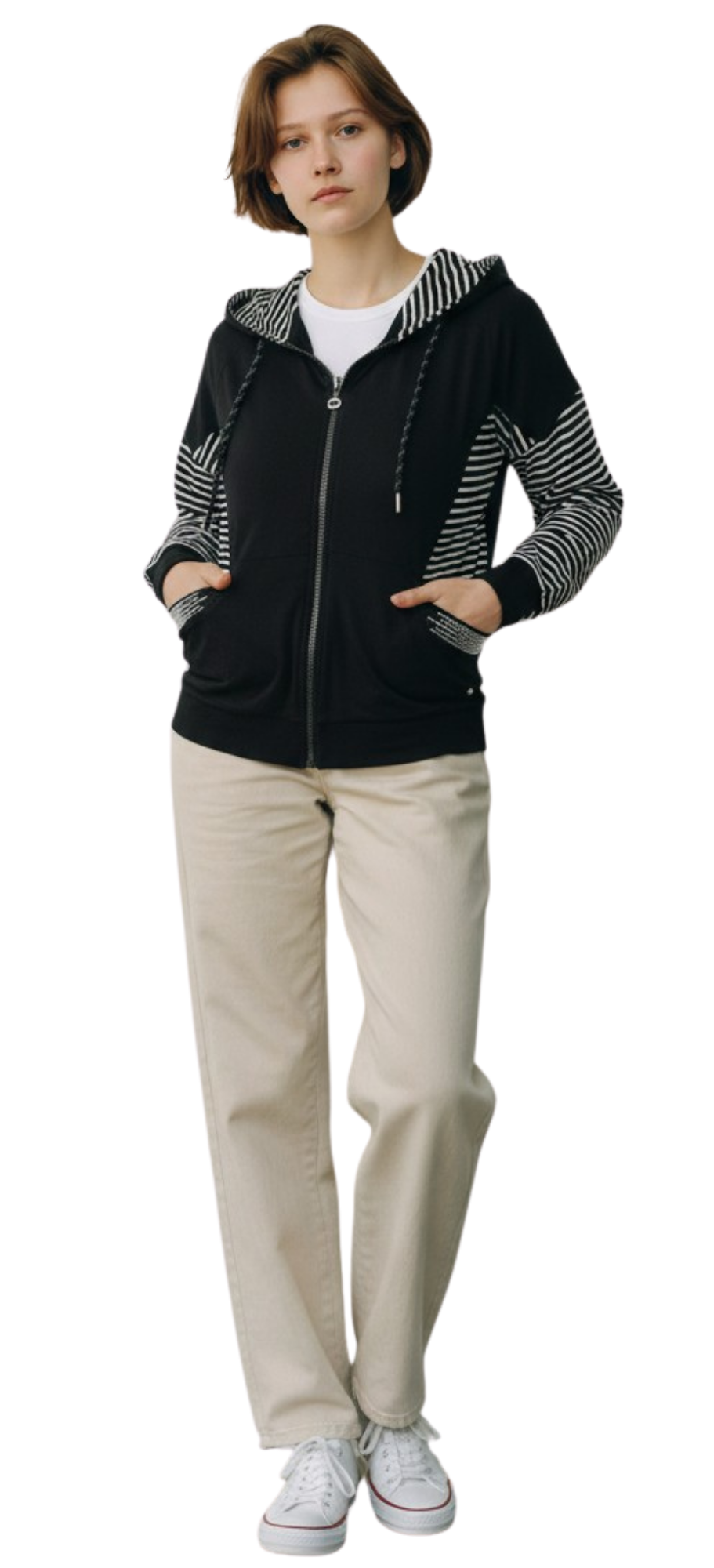 Die Jacke G31-9200 von Gio Milano vereint Stil und Komfort in einem modernen Design. Gestreifte Ärmel und zwei Eingrifftaschen mit Strassbesatz setzen modische Akzente, während die Kapuze mit Tunnelzug für Flexibilität und Schutz bei kühlem Wetter sorgt. Das elastische Material und der praktische Reißverschluss garantieren hohen Tragekomfort und einfache Handhabung. Eine vielseitige Jacke für Freizeit, Alltag und trendige Casual-Looks.