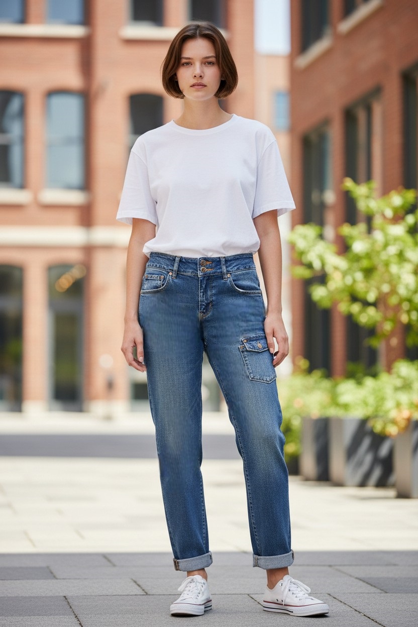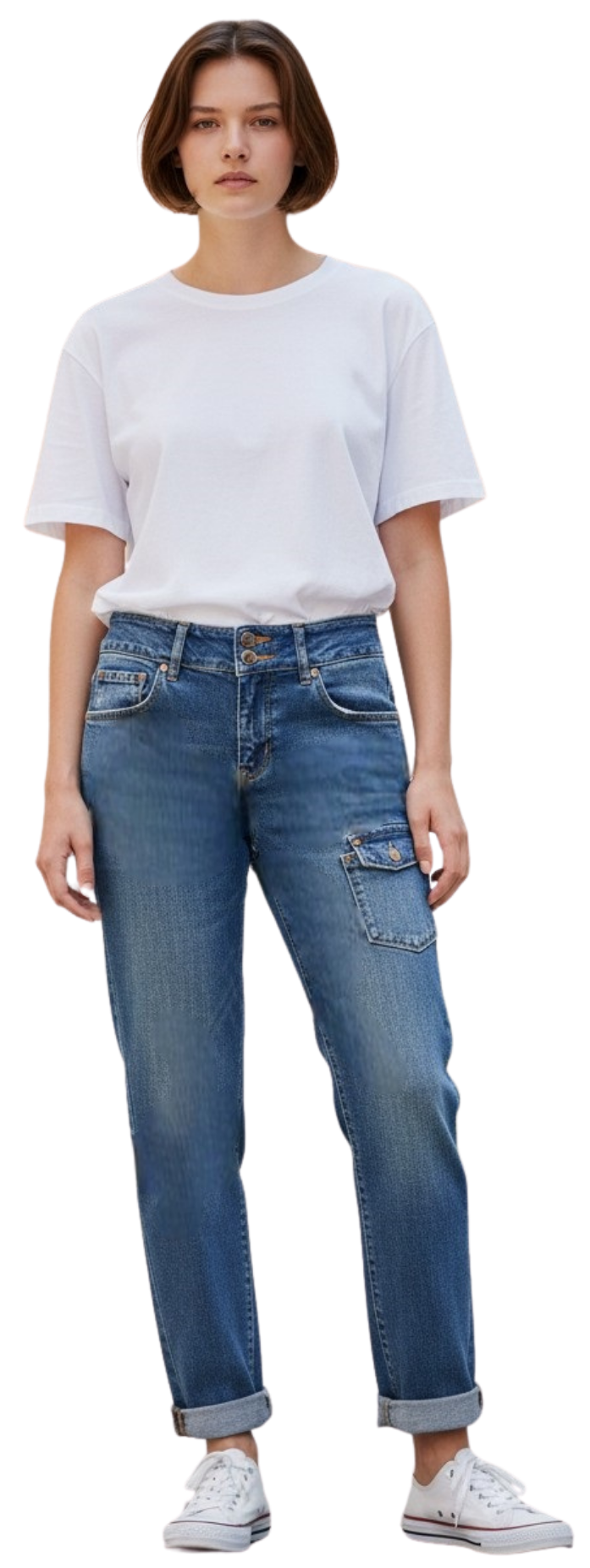 - Kurzbeschreibung: Cargo Jeans mit Destroyed Finish, Mittlere Leibhöhe (24 cm bei Größe 27), Breiter angesetzter Bund, Aufgesetzte Seitentasche, Unser Model ist 1,77 m groß und trägt die Jeansgröße 27,