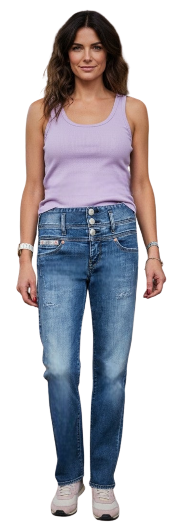 Die Raya Jeans hat einen auffälligen hohen Bund, der vorne mit drei Knöpfen geschlossen wird... mehr