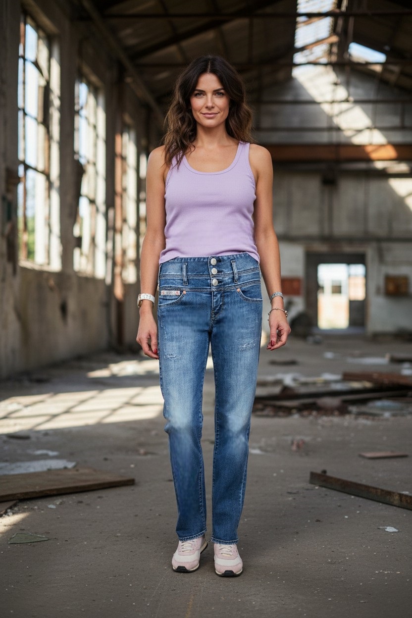 - Kurzbeschreibung: Hoher Bund mit markantem Dreiknopfverschluss, Hohe Leibhöhe (26 cm bei Größe 27), Lockerer Beinverlauf mit seitlichen Keileinsätzen, Innere Schrittlänge: 74 cm, Fussweite: 44 cm,