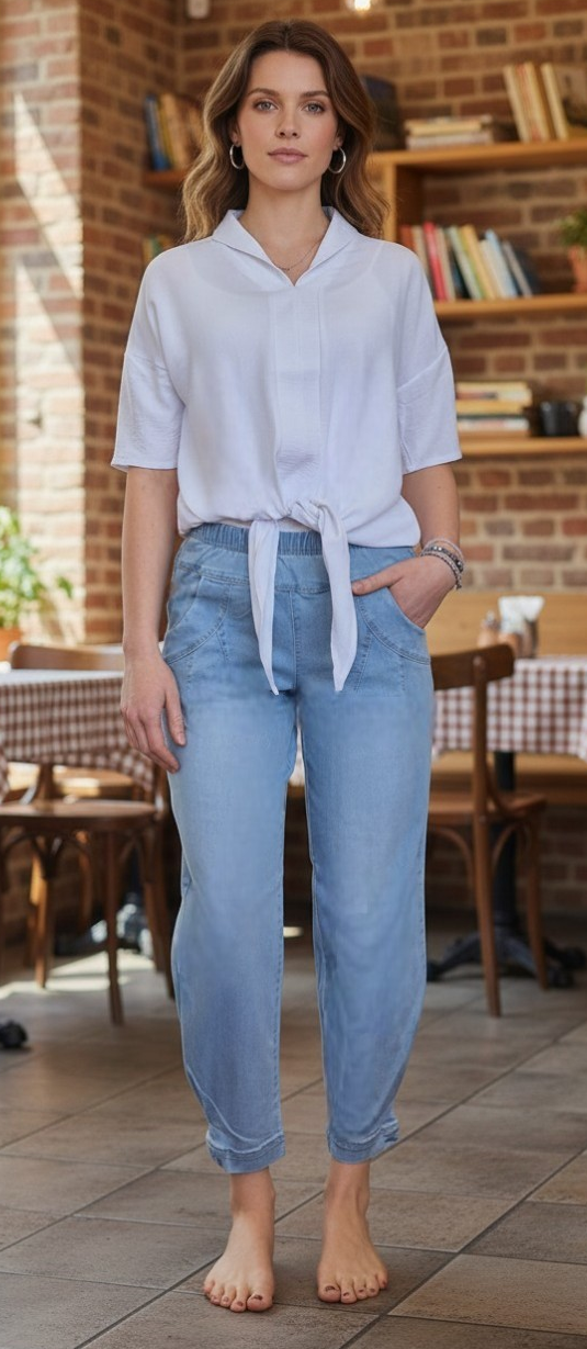 Dezente Details wie seitliche Eingrifftaschen und ein cleaner Wasch-Look unterstreichen den lässigen Charakter. Ob mit Sneakern und T-Shirt für einen casual Style oder kombiniert mit Bluse und leichten Schuhen – diese Schlupf-Jeans ist vielseitig, bequem und ideal für jeden Tag.