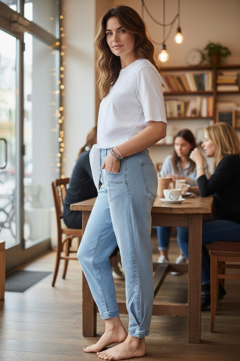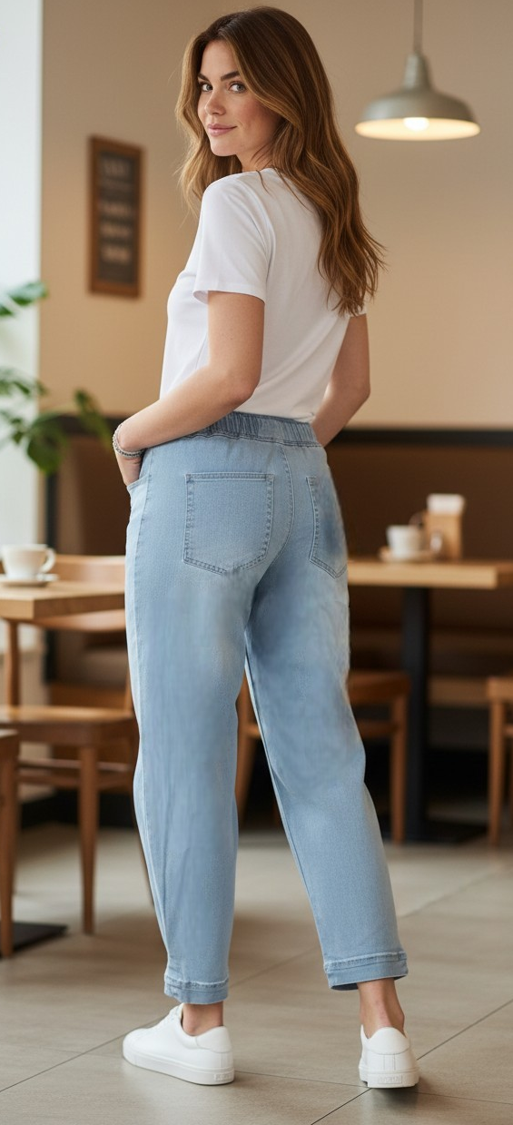 Der elastische Bund ersetzt den klassischen Verschluss und macht das An- und Ausziehen besonders unkompliziert – ganz ohne Knöpfe oder Reißverschluss. Der lockere Schnitt verleiht der Jeans eine entspannte Silhouette, die weder einengt noch an Form verliert.