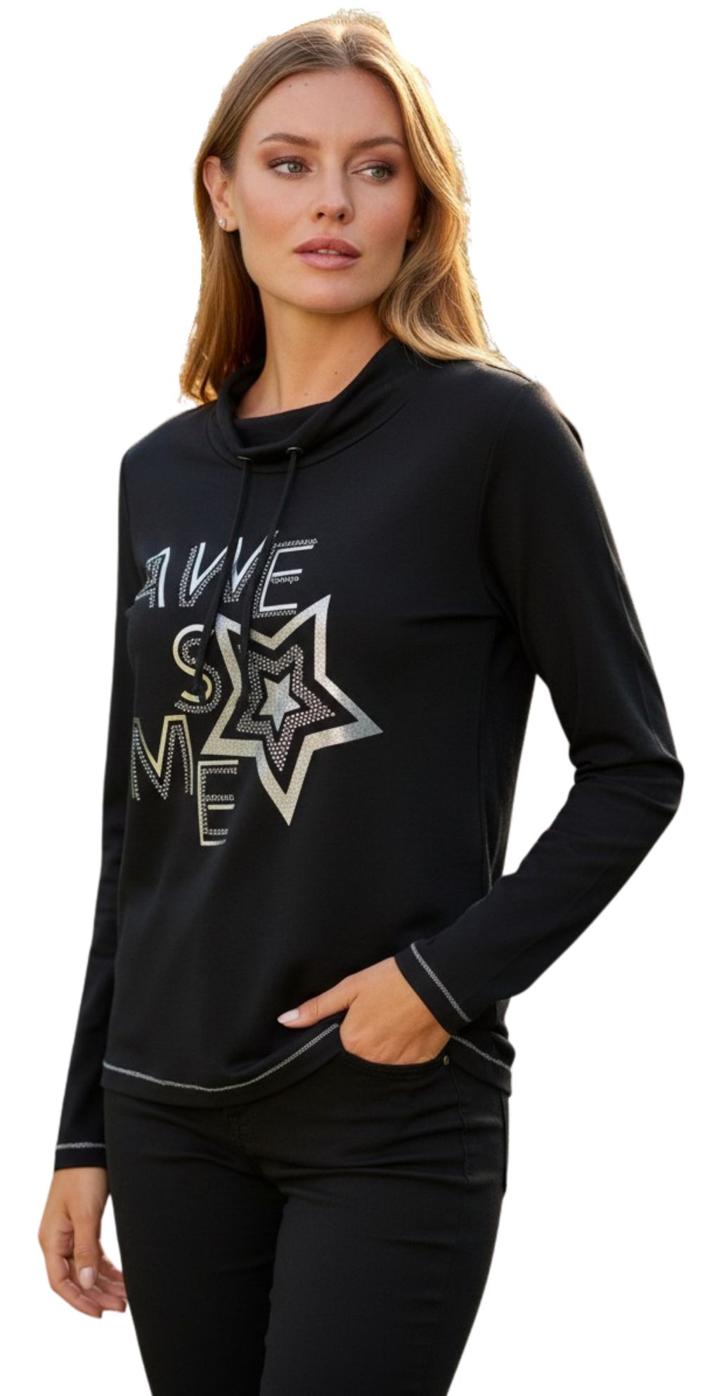 - Kurzbeschreibung: funkelnde Strasssteine, raffinierter Silberdruck, Ziernähten an den Ärmelbündchen und am Saum, Tunnelzug am Kragen, Model trägt Gr. M,